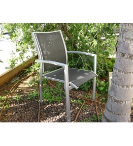כיסא מאלומיניום בצבע סילבר (אפור) מאוד נוח עם ריפוד בד טקסליין במבחר צבעים : שמפניה שחור , אפור ולבן נערמים אחד על השני. נועד לבחוץ, ריהוט גן העומד בכל תנאי מזג אוויר.